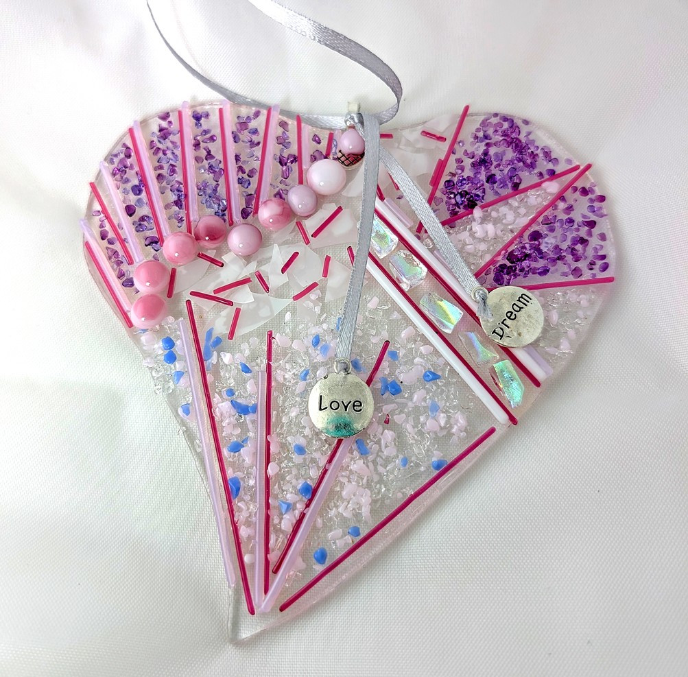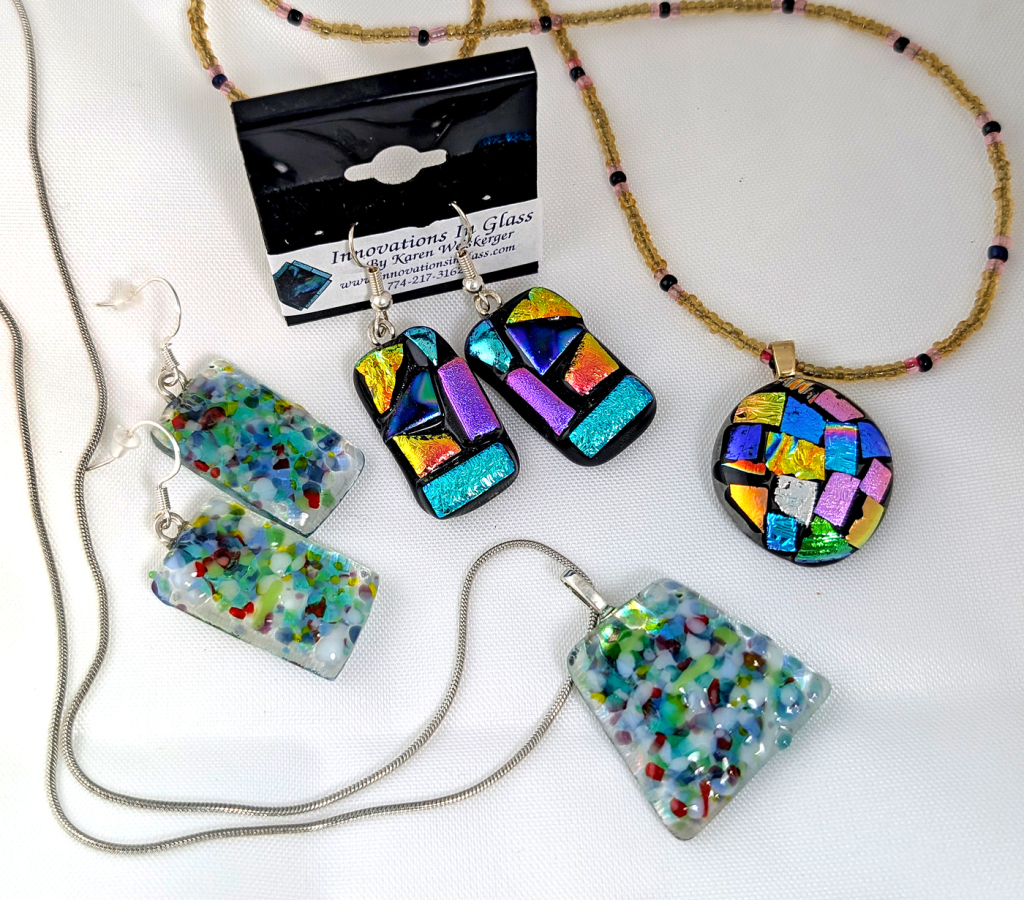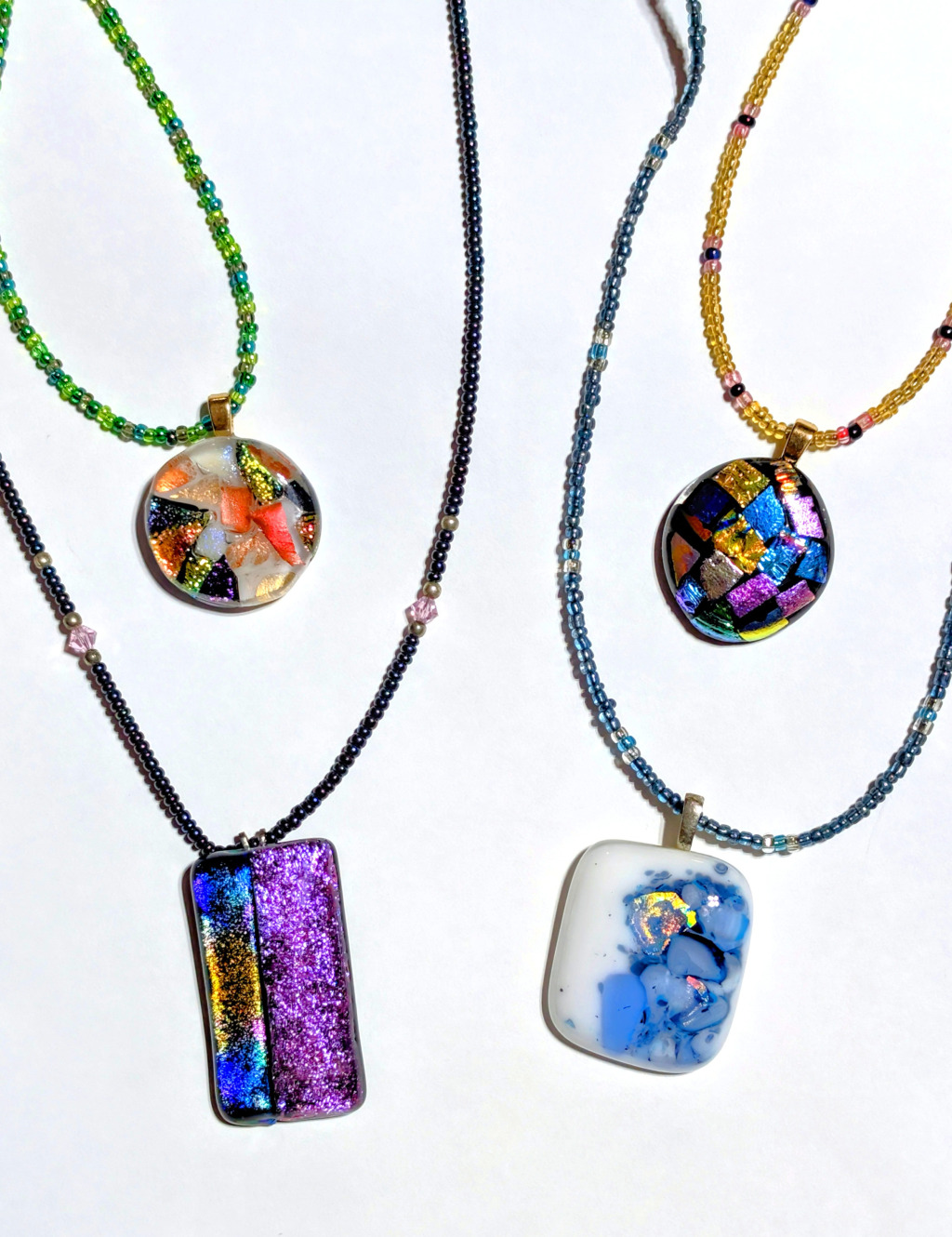 Make earrings and necklaces using dichroic glass. Choose a beaded chain created by you or a silver finish. This class can be brought to you for the perfect friend get together.