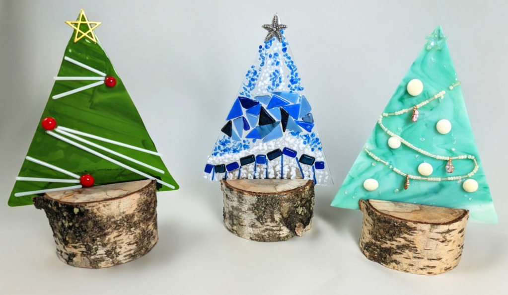 Design a mixed media tree for the holidays, or create a tree to leave out all year long. Your choice of stand type is included. If you create a tree that needs to be fused, it will be ready to take home by Monday, December 8.